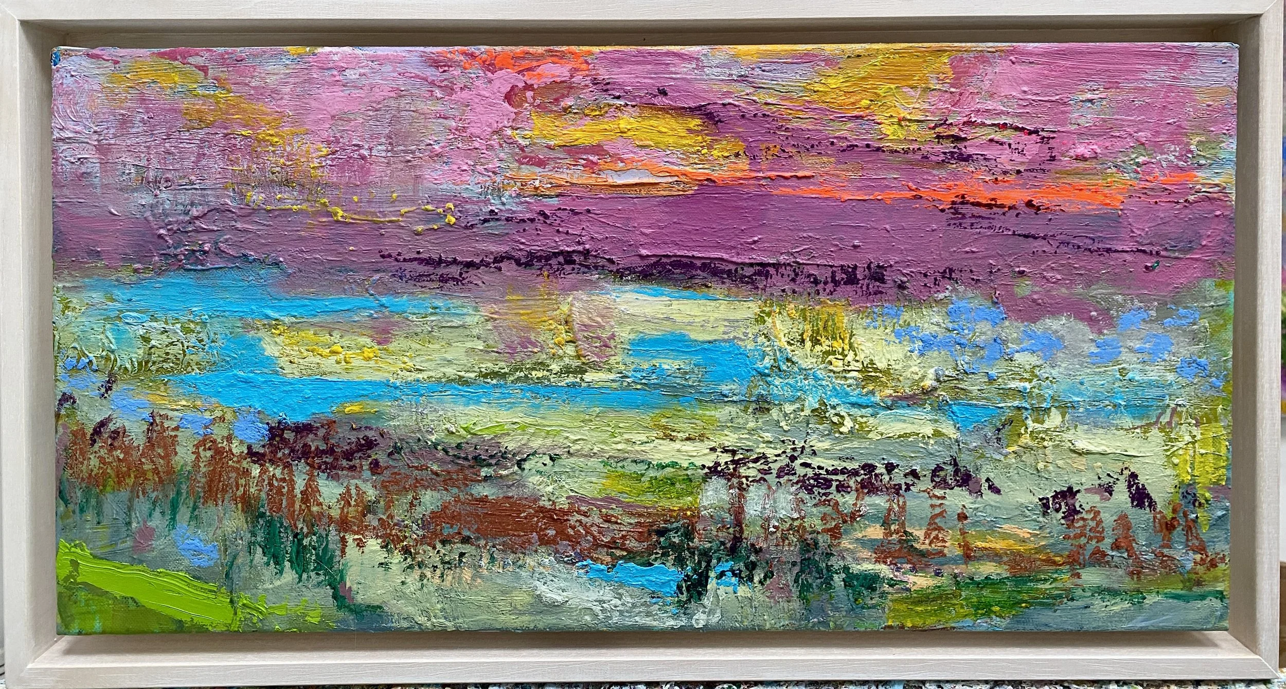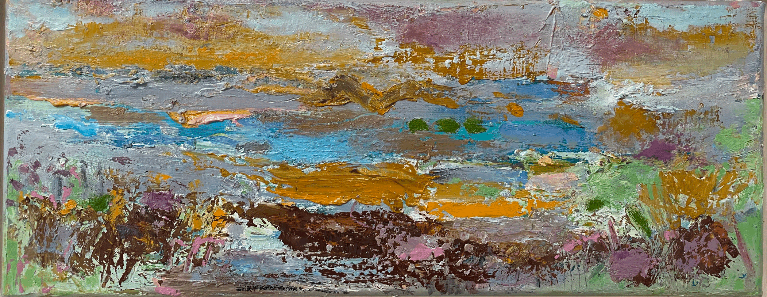 My painting process is oil on canvas, often with additional collage and drawing to add texture or detail. Scraping through layers of paint allows light and special effects of weather and sky to show through, as well as bright splashes of garden or wild flowers or everyday objects from the shoreline or interior spaces.